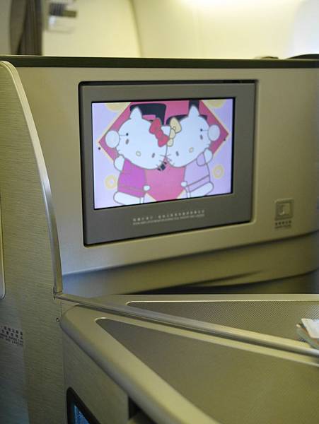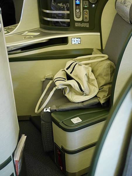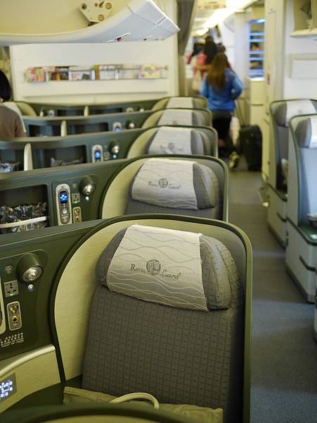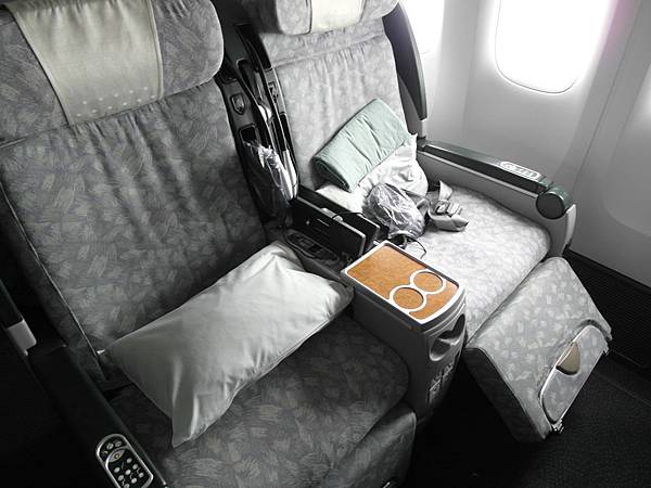 上了飛機後,總算第一次見識到皇璽桂冠艙,果然變得很豪華的樣子,樣式跟國泰最新的商務艙是同一款,採取1-2-1位置配置,空間大上許多,也能夠平躺,置物空間也規劃得非常好。