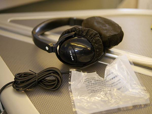比照起華航,長榮的確有越來越「精緻」的走向,但要說起不足之處仍然非常多,lounge是一例,然後即使貴為皇璽桂冠艙,耳機還是一樣的造型,衛生起見請乘客自行戴套之後變成了這樣子(下圖),一整個不高級感。