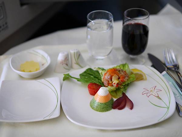 皇璽桂冠艙是目前長榮最高級的艙等,飛機餐卻沒有比較好吃,簡單說「難吃」形容都不為過,比起一直退步的國泰航空餐點,長榮的商務艙餐點前菜擺盤還不錯看,白色瓷盤尚稱雅致,可惜食物沒什麼味道,比較適合給嬰兒吃,至於主菜的樣式,奉上兩張台北-胡志明來回的照片,沒有修圖畫質也不算差,各位儘管想像看看,當然稱不上美味,而且這趟短程沒有香檳王2004喝,酒單上的那款香檳則是災難,喝了兩口就還給空服員
