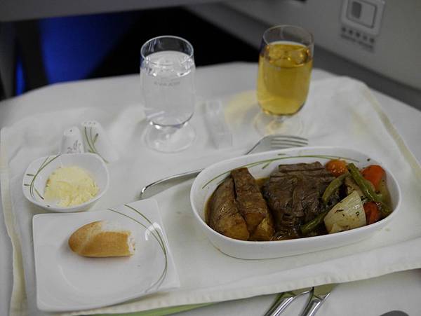 正當我暗自欣喜,我這頭的空服員比較親切,姊姊那頭的一臉跩樣(華航臉)時,上這道牛排主餐的瞬間,空服員夾餐盤時脫手了!~脫手了~!也就是說,餐盤是強行降落在我的桌上,然後肉汁就跟黃石公園那個間歇泉一樣瞬間噴發!!幸虧從小吃牛排無論是不是鐵盤,我養成了「舉起餐巾防潑灑」的下意識動作,沒有被噴到,欣喜不超過1.5秒,發現放在置物架的相機遭流彈擊中!!(淚)