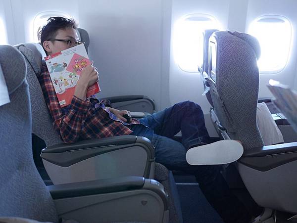 高中時跟著爹地去巴黎,(多了一個人花費),害他犧牲商務艙的舒適,跟我一起搭長榮客艙,基本上Premium Economy class也是長榮發明的,更舒適的位置+沒升等的食物在中外獲得了好評,因為空蕩蕩也就不客氣的試坐跟拍幾張照,位置還算寬敞,我的身高超過了180,還是伸縮自如可以翹二郎腿(下圖)。