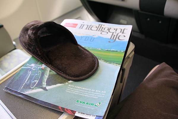 然後是拖鞋,為此還跟長榮官方反應過,拖鞋的品質讓人不敢領教,布面粗糙不說,鞋跟處大概就是塞了一片棉而已,非常不好穿。