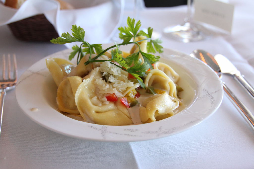 約11個小時供應的是一頓晚餐跟早餐,我挑選的主菜是義大利餃,前菜上的是魚子醬,其實可以在擺盤上更細緻一點,份量也不少,可惜沒有木湯匙(目前供應魚子醬專屬湯匙的並不多),食用完上了沙拉與麵包
