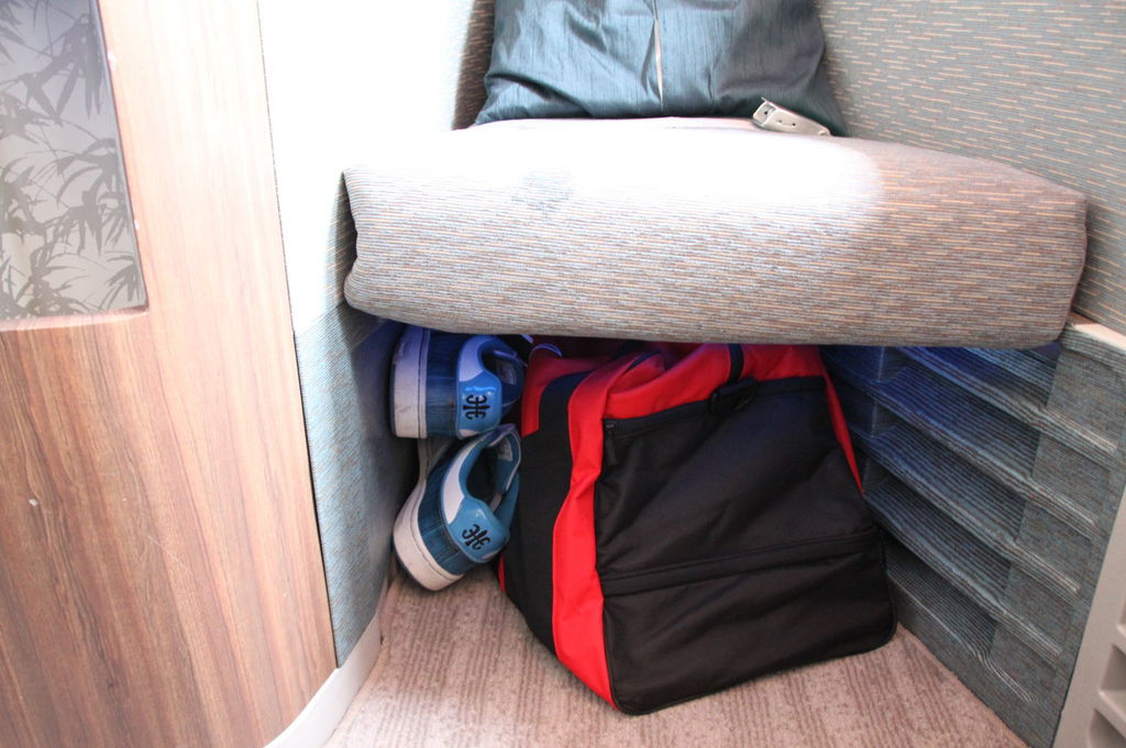當代頭等艙的設計,在座位區還設有一張「秘書椅」,平日可以當腳踏、延伸成為夜床的一部份,然後大老闆有事跟秘書討論,你的屬下朋友可以進入座位區而不必站著妨礙其他乘客,只不過多數時間,還是給大家塞行李,從圖中看來,深度也十分足夠。