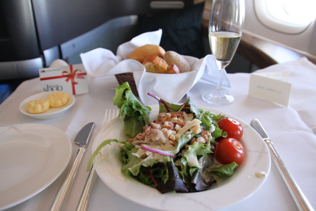 沙拉與義大利餃的味道都很好,確實這才是高階艙等該有的味道,近來很多商務艙的餐點裝盤就像是經濟艙那樣隨意,有時讓人難以領教,當新興國家的民航空司絞盡腦汁招攬顧客、無所不在的體貼新招,確實對這些老舊思維的老招牌有不小衝擊,對花錢的人而言都是好事。