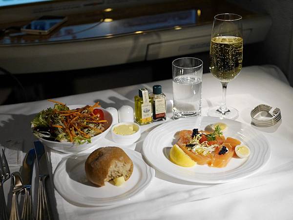 抱持著「等會在頭等艙」要吃好的心態,當時沒多取什麼吃,但每一樣都樂勝你在桃機、國泰__堂見到的水平,酒款則是差不多,香檳則是凱歌(Veuve Clicquot Ponsardin ),厭惡了Moet系列加上屬性合,斟了一杯佐餐