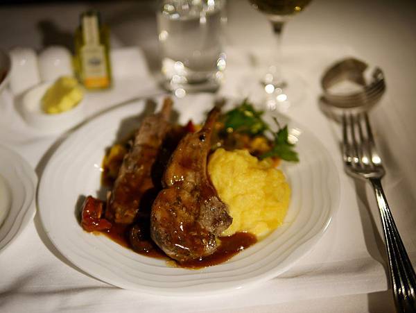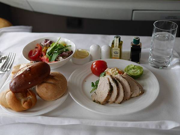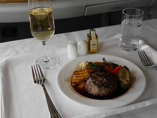 餐點部分,水平相當出色,份量也很足夠,特別他主張這只是"light meal"~一套下來正常人都能吃得飽,唯獨回程主餐的牛菲力稍有點乾,部位是比其他家飛機餐的好,但遇上了吃牛肉很挑的我,2014年開始不知為何,兩週一次都得在台北吃一頓昂貴牛排:A Cut-Robin's-茹絲葵-N°168一直輪著吃,頭等艙呈現的水平自然不及那幾家,卻已經很不錯。