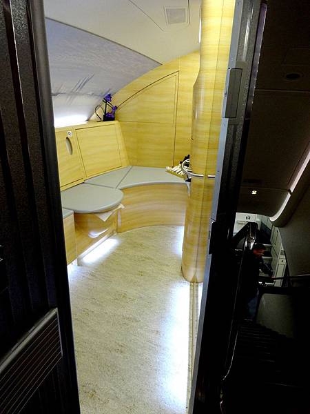 因為座位在第一排,起飛前就問了專門負責淋浴間的FA,說能不能先拍一拍然後開心的跟個小鬼觀光客一樣亂走亂拍,以往搭新見到的商務艙時,總會很顧形象的盡量不要太招搖,可是這次是A380耶!不管了(以後也不管了)就是拍拍拍