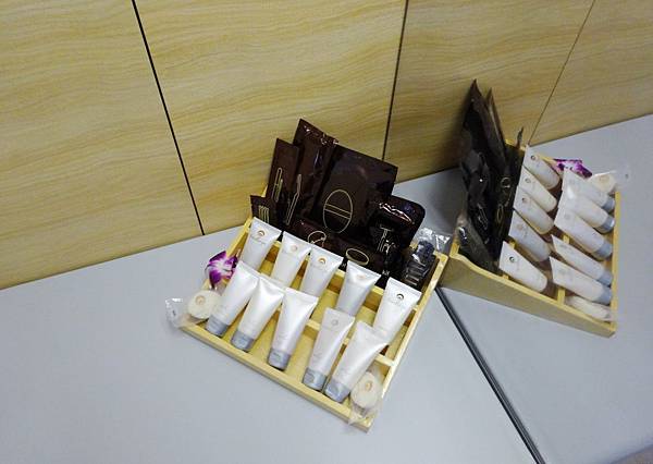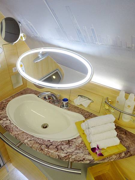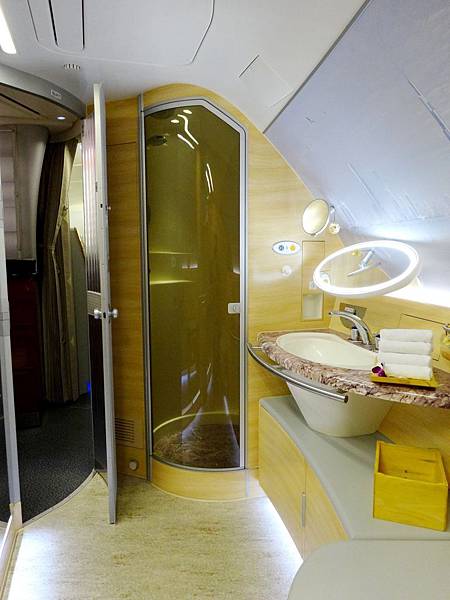 往前幾步就是阿聯酋獨步全球的「頭等艙淋浴間」,佈置的非常素雅,也擺了許多備品在裡頭,而且每一個顧客使用(淋浴或者上廁所)完畢那位fa就會過去清理一次,所以不會髒亂,裡面的抽屜很多放了不少備品,因為我比較不注重細節就沒有拍。