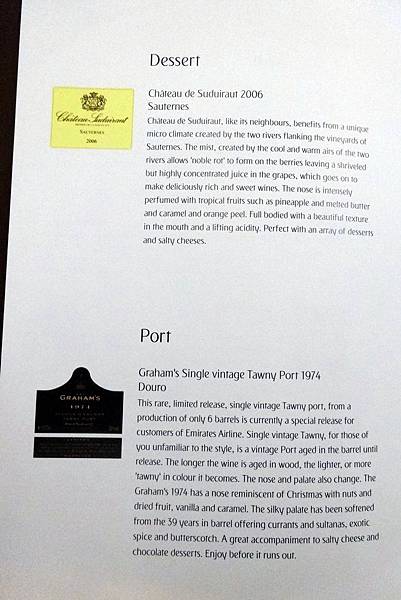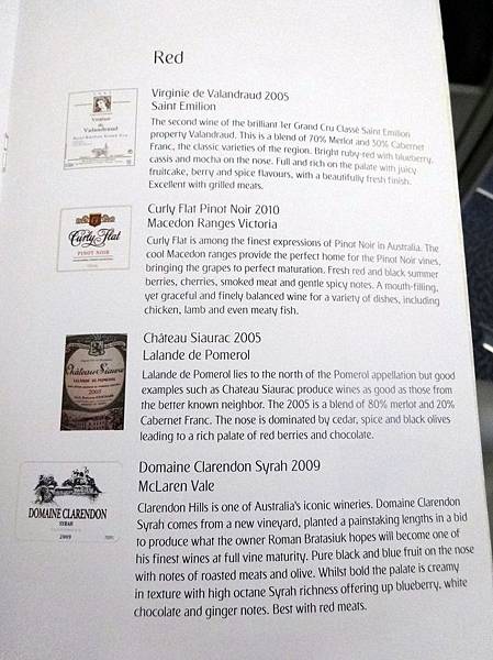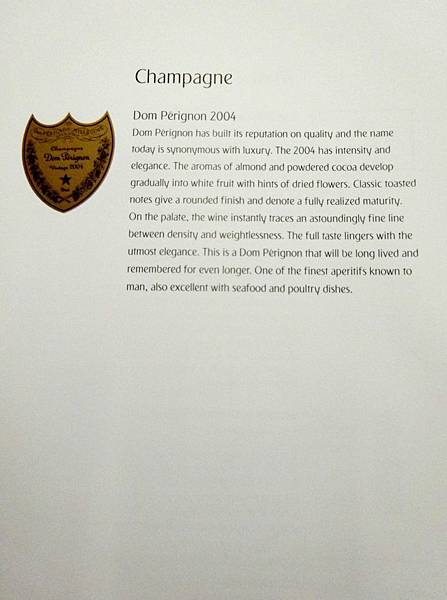 飛機起飛前,頭等艙喝到的跟商務艙一樣,只有Moet普通版(驚),起飛以後才提供香檳王(Dom Pérignon),幸虧今年各家航空提供的都是2004,2003香檳王評價不高,實話就是很難喝,所以整個2014年如果朋友們有幸搭乘供應2004這年份的班機,不必猶豫就給它飲下去。