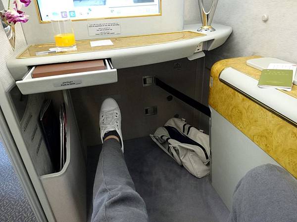 A380套房並非沒有缺點,這裡還是得寫,首先是置物空間,許多家的頭等艙都有優異的設計,但EK的設計明顯是要你放在「腳旁邊偌大的空間」~另外,舒適度沒問題,但寬度似乎不太夠,國泰在內許多家的頭等艙(點看文章)位置寬敞得多,雖然沒有胖到120公斤應該感受不到,但是當它變成平躺的床,就有差了。