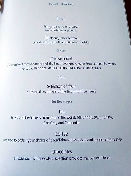 HKG-BKK 只能算是短距離航程,即使是頭等艙貴賓,連免費轎車接送都沒有,單子上寫著這是Light Meal,比較起其他艙等,還是一套完整的餐,前菜主餐起司盤到甜食都有