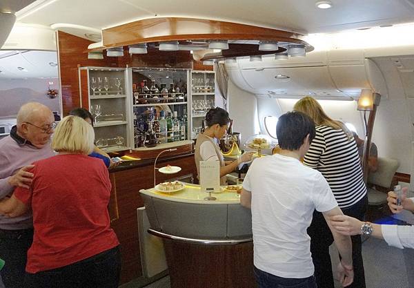 阿聯酋航空很自豪的設計,就是弄了個空中酒吧,在上層機艙的最後端,對於頭等艙旅客來說,你得跨過多達七十幾位的商務艙區域才能抵達,酒吧提供一些小食、還有種類繁多的酒,包括許多別家頭等艙才能喝到的約翰走路藍標。