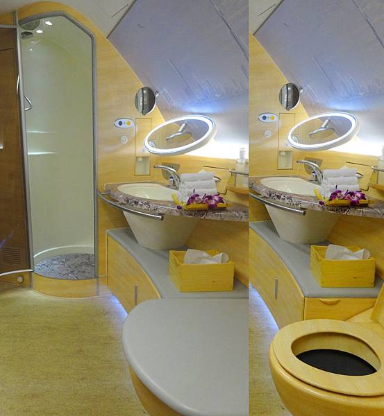 飛機上居然能有淋浴間,對HKG-BKK這種短航程是沒什麼實用性,各航空的貴賓室也導入洗澡的設施,所以EK這個設施噱頭大於於實用,且看A380的上層設計便知道,那兩個對稱位置很尷尬,中間部分是前機的樓梯(飛機最前、最後面各一支樓梯),根本不可能擺上(付了大錢來)頭等艙機位,除非...A380全球第一架是交給中國/台灣的公司 XD