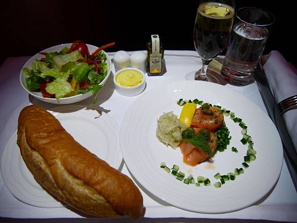 A380 執飛台北這段只有2艙,原本2樓頭等艙的位置拿去改經濟艙,位置一樣大、空間卻寬敞不少,而且最棒的是廁所非常大,甚至比商務艙專用(酒吧區)的還要大,如果商務艙前幾排的乘客,建議乾脆去走過布簾、到前面使用;比較起先前寒酸版本,A380商務艙座位1-2-1的設計才是世界主流,讓你那張票花的更值得,畢竟花錢買商務艙的多數人不圖什麼美食享受(除非你是第一次),而是位置更舒適+討厭被吵